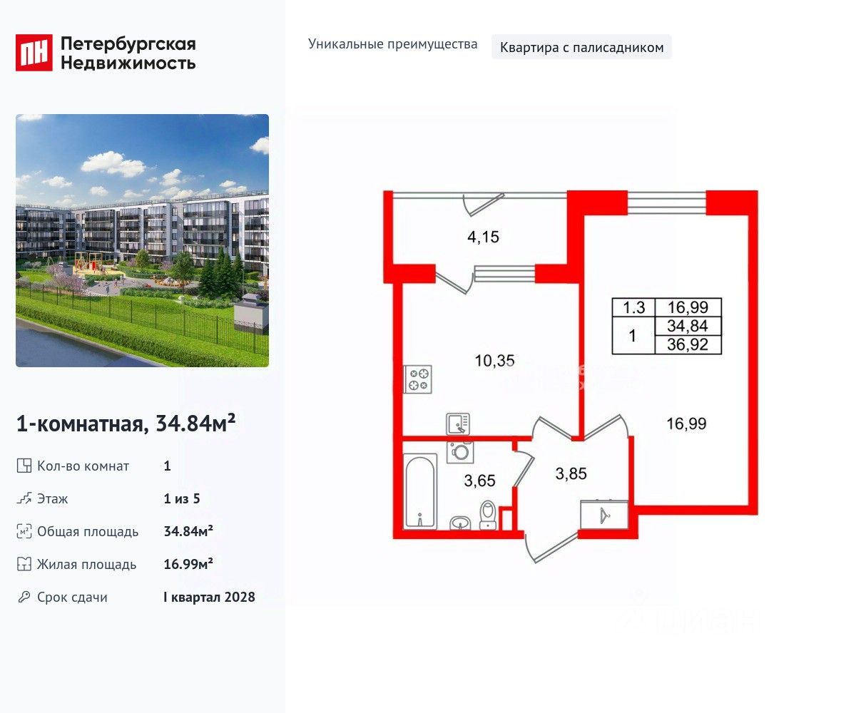 Уникальная планировка, кухня 10.35 м², вместительная прихожая 3.85 м². Общая площадь квартиры - 34.84 м², жилая 16.99 м², высота потолка 2.77 м.