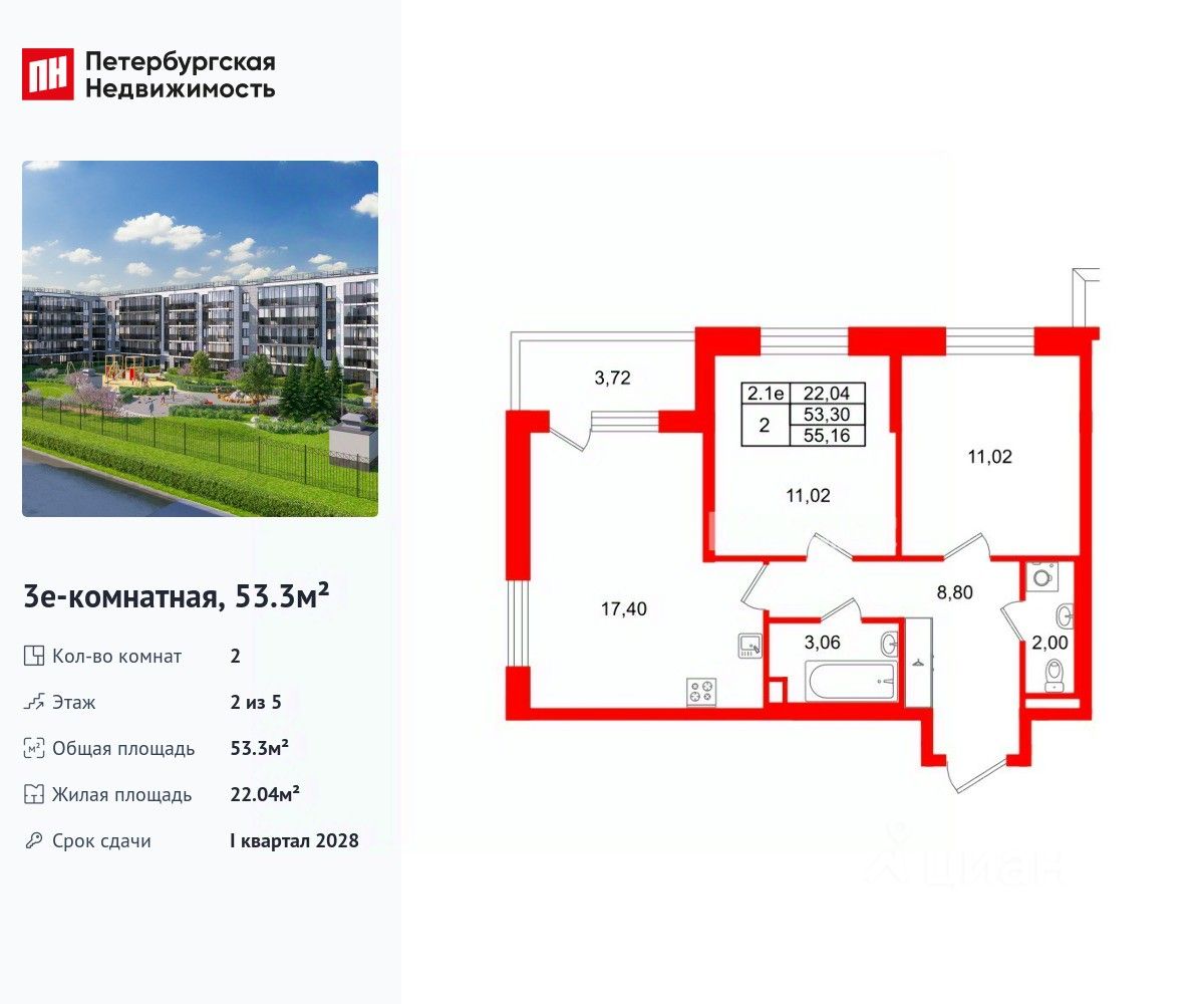 Удобная, классическая, функциональная европланировка, большая кухня-гостиная 17.4 м², просторная прихожая 8.8 м². Общая площадь квартиры - 53.3 м², жилая 22.04 м², высота потолка 2.77 м.