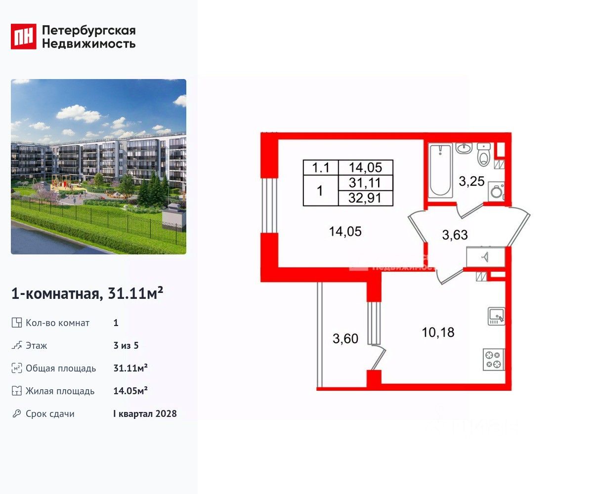 Общая площадь31,11 м2