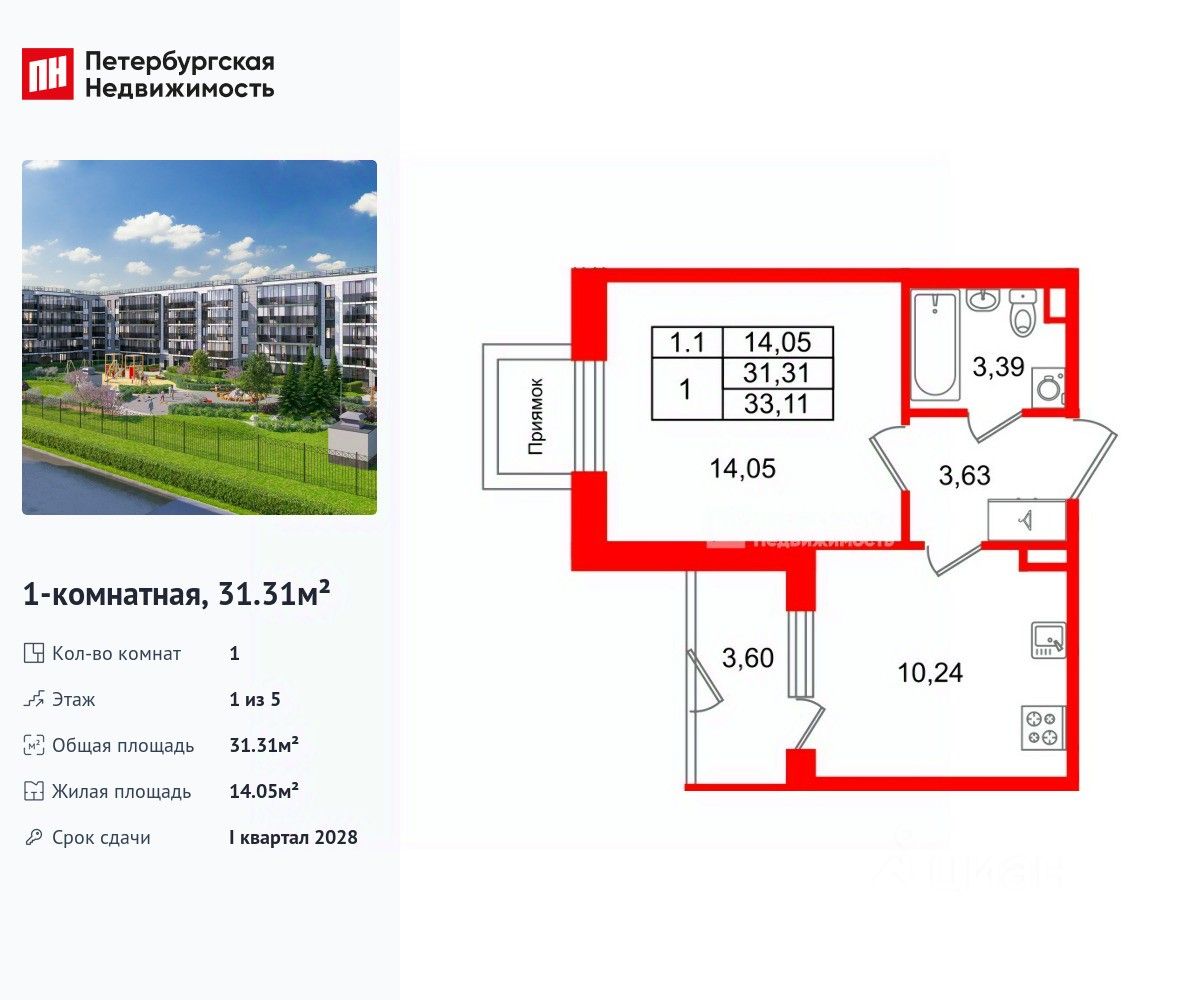 Удобная, классическая планировка, кухня 10.24 м², вместительная прихожая 3.63 м². Общая площадь квартиры - 31.31 м², жилая 14.05 м², высота потолка 2.77 м.