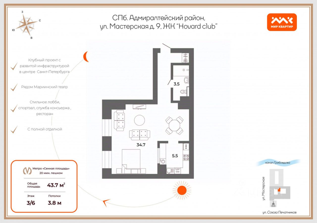 Арт. 103729674 Предлагаем вашему вниманию апартамент общей площадью 43,7 кв.м. в новом клубном доме у Мариинского театра.