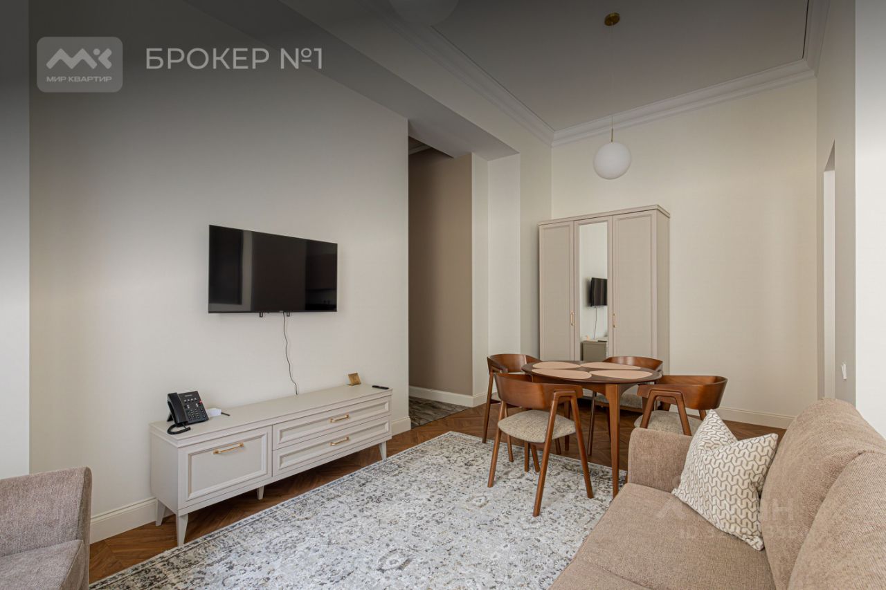 Апартамент расположен на 3 этаже, высота потолков 3,80 м, с роскошной отделкой и мебелировкой в классическом стиле. Апартаменты находятся в историческом центре Санкт-Петербурга.