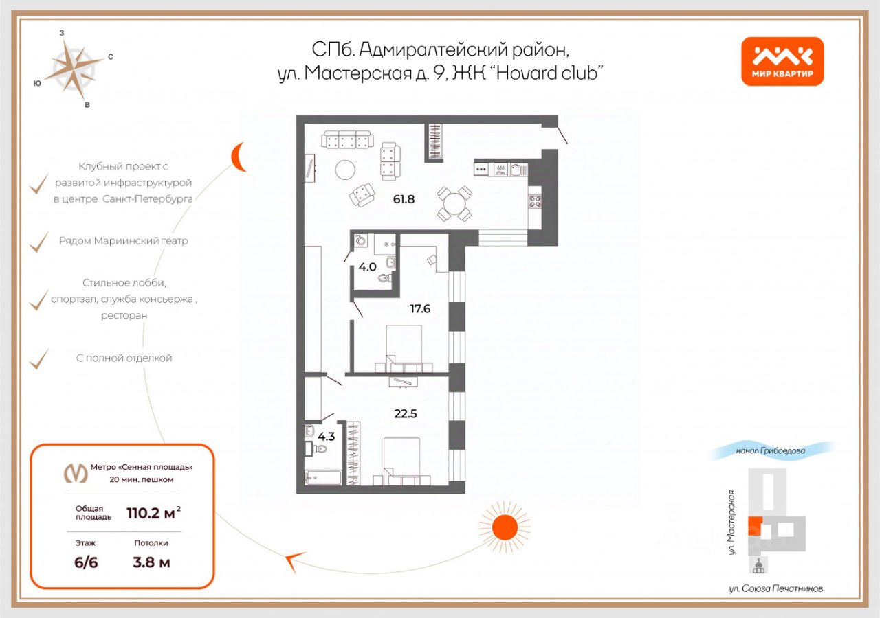 Арт. 103731916 Предлагаем вашему вниманию апартамент общей площадью 110,2 кв.м. в новом клубном доме у Мариинского театра.