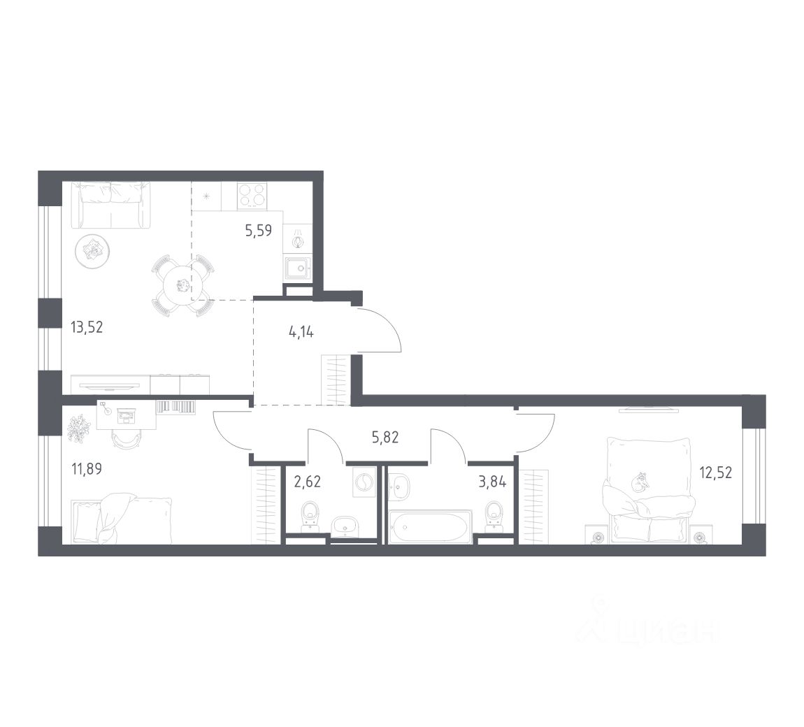 Строим кварталы для жизни с заботой о будущем. Предлагается 2-комнатная квартира комфорт-класса площадью 59,94 кв.м в корпусе 96 на 18-м этаже, в жилом комплексе ''Живи! В Рыбацком''.