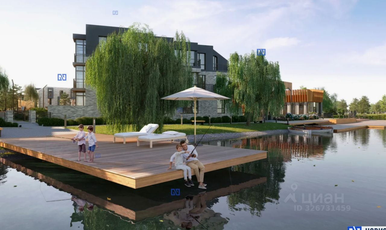 На территории: видеонаблюдение, детские и спортивные площадки, ландшафтный дизайн, пирс на реке.