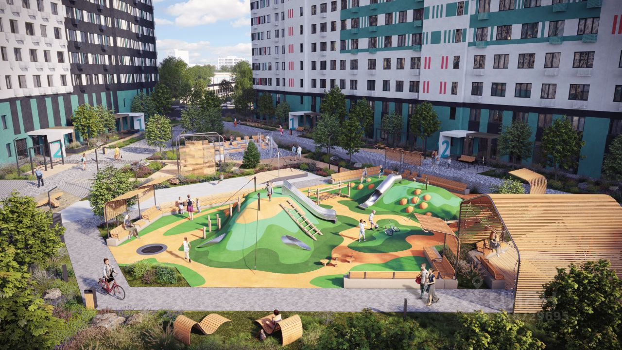 В просторном внутреннем дворе под тенью больших деревьев каждый найдёт себе развлечение на свежем воздухе: зоны отдыха, площадка для настольных игр, зиплайн, экодорожки, детские площадки для разных возрастов, амфитеатр с контактным фонтаном позволят проводить время с семьёй и встречаться с друзьями, не выходя за пределы квартала.
