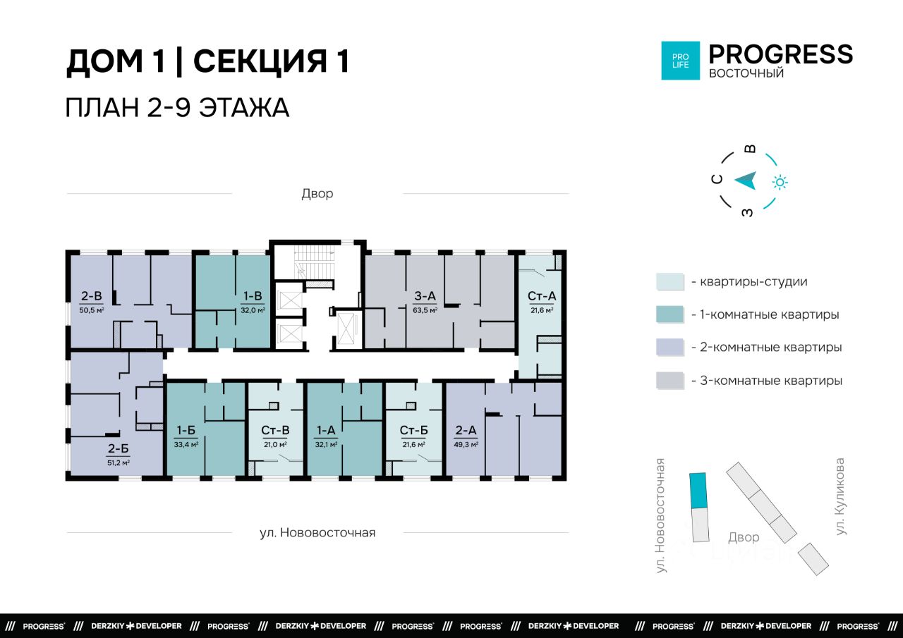 Городской квартал ''PROGRESS Восточный'' находится в обустроенном и востребованном районе на улице Нововосточная. Проект состоит из трёх домов переменной высоты от 17 до 24 этажей. Всё для комфортной жизни рядом: торговые центры ''Три кота'' и ''Восточный'', школы, детские сады, тренажёрные залы, аптеки и поликлиники. Удобное расположение транспортных развязок: 6 остановок, 9 маршрутов общественного транспорта. Выезд на основную проезжую часть ул. Нововосточная.