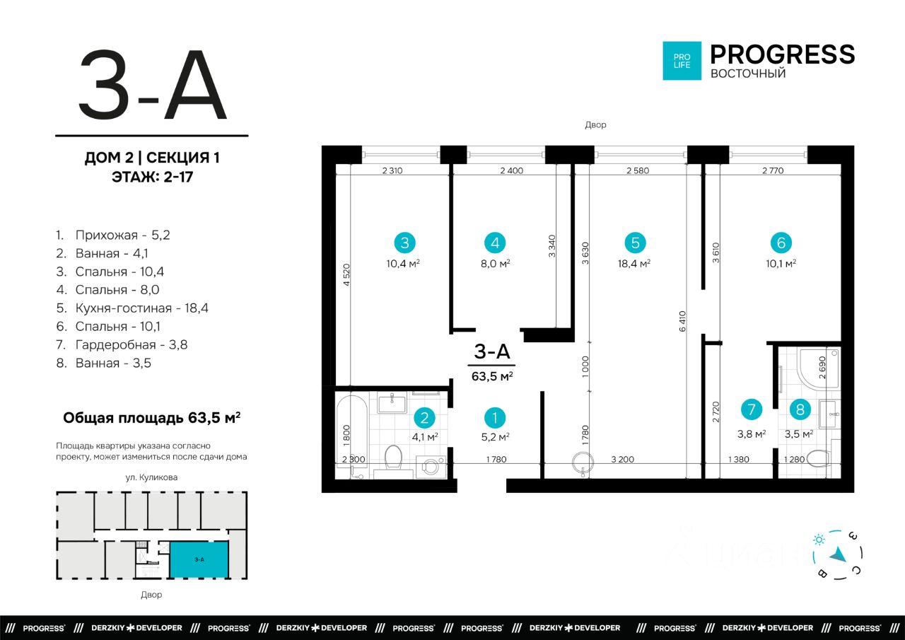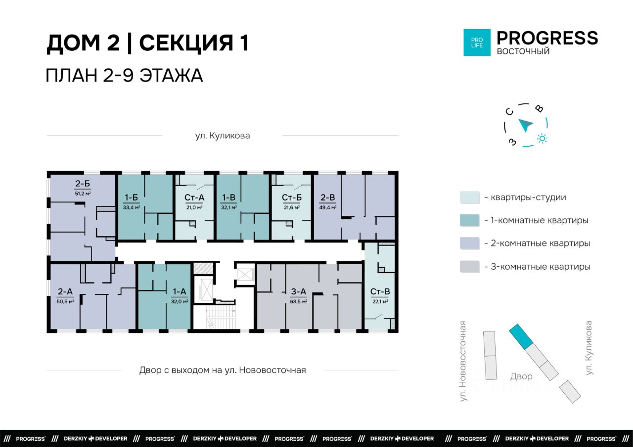 Городской квартал ''PROGRESS Восточный'' находится в обустроенном и востребованном районе на улице Нововосточная. Проект состоит из трёх домов переменной высоты от 17 до 24 этажей. Всё для комфортной жизни рядом: торговые центры ''Три кота'' и ''Восточный'', школы, детские сады, тренажёрные залы, аптеки и поликлиники. Удобное расположение транспортных развязок: 6 остановок, 9 маршрутов общественного транспорта. Выезд на основную проезжую часть ул. Нововосточная.