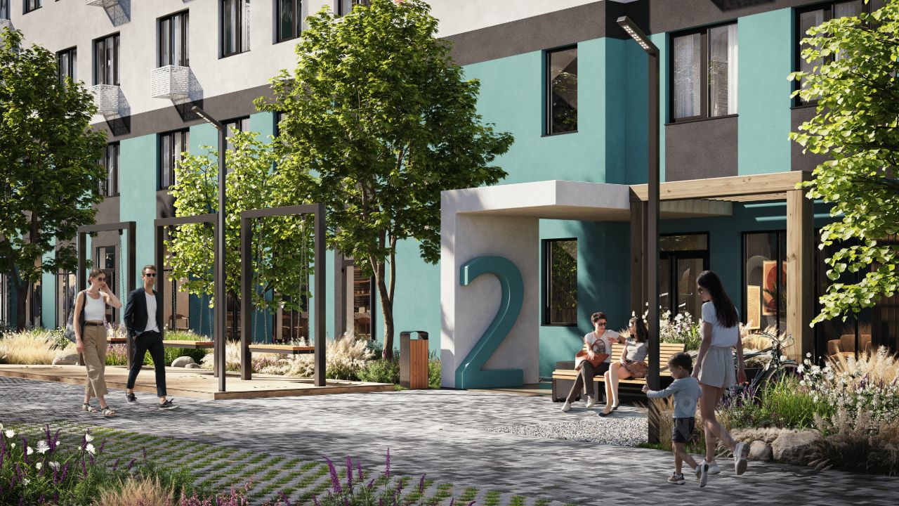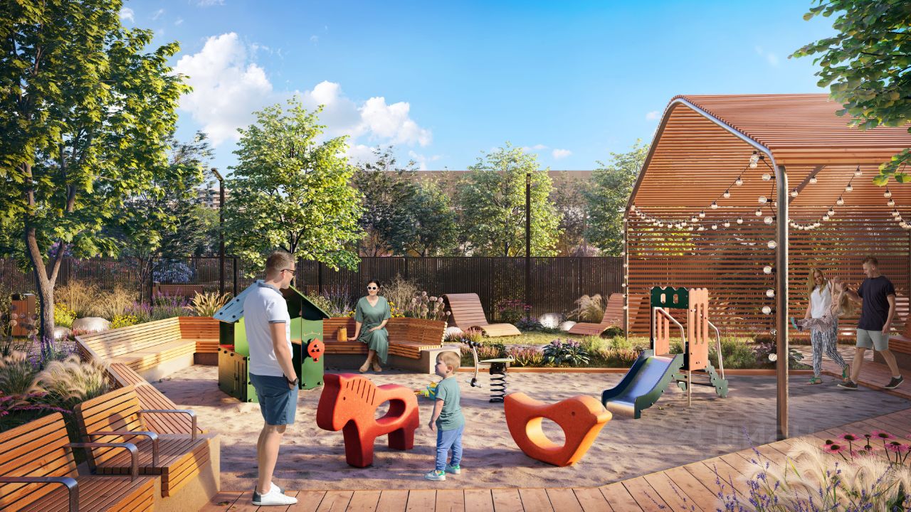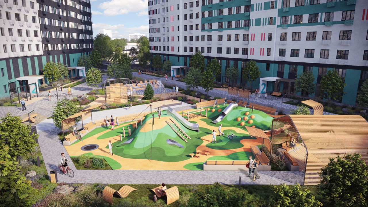 В просторном внутреннем дворе под тенью больших деревьев каждый найдёт себе развлечение на свежем воздухе: зоны отдыха, площадка для настольных игр, зиплайн, экодорожки, детские площадки для разных возрастов, амфитеатр с контактным фонтаном позволят проводить время с семьёй и встречаться с друзьями, не выходя за пределы квартала.