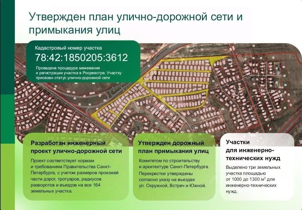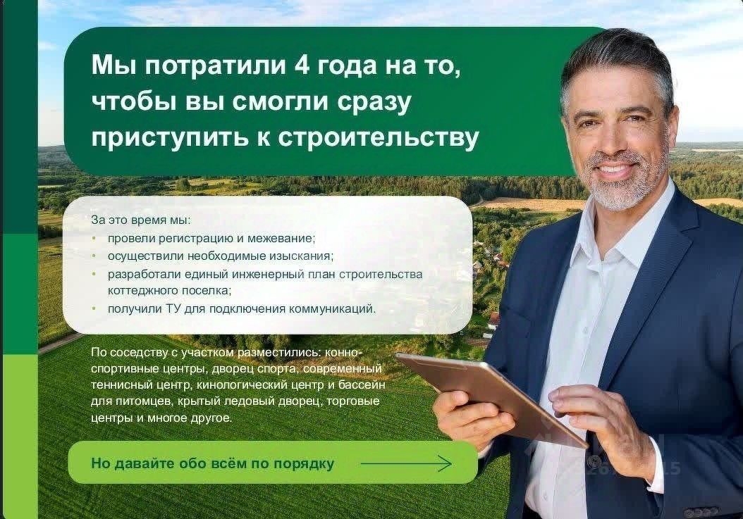 Мы потратили 4 года на то, чтобы вы смогли сразу приступить к строительству! За это время мы: • провели регистрацию и межевание, • осуществили необходимые изыскания, • разработали единый инженерный план строительства коттеджного поселка, • получили ТУ для подключения коммуникаций.
