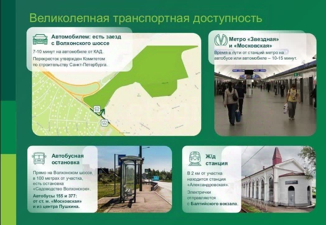 Участок расположен на юге Санкт-Петербурга. Примыкает к поселку Александровская и г. Пушкин 1 км (2 минуты) до Пулковского шоссе 6 км (10 минут) до центра г. Пушкин 8 км (10 минут) до КАД 10 км (12 минут) до Аэропорта Пулково 12 км (14 минут) до метро Московская