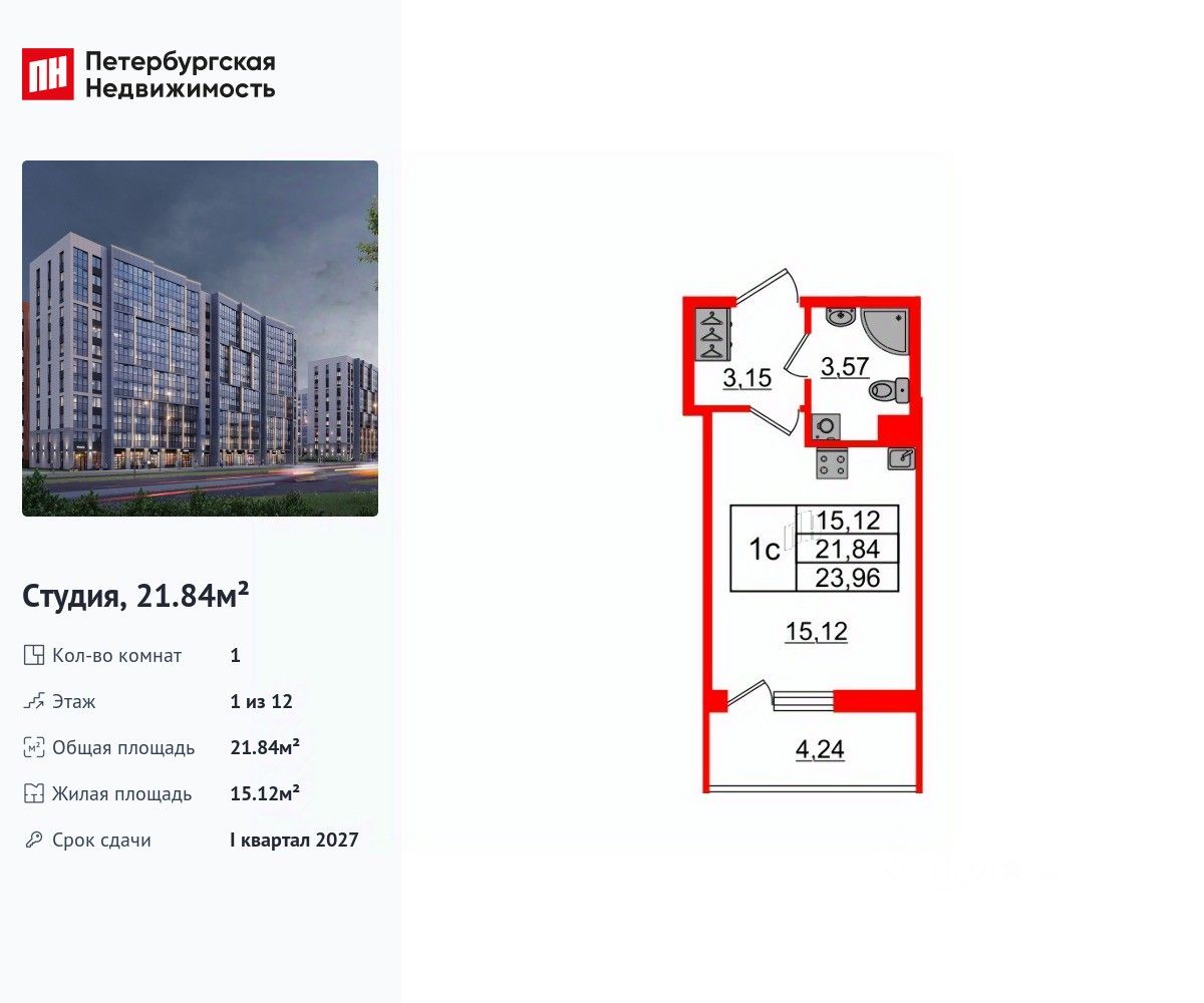 Удобная, классическая, функциональная европланировка, вместительная прихожая 3.15 м². Общая площадь студии - 21.84 м², жилая 15.12 м², высота потолка 2.77 м.