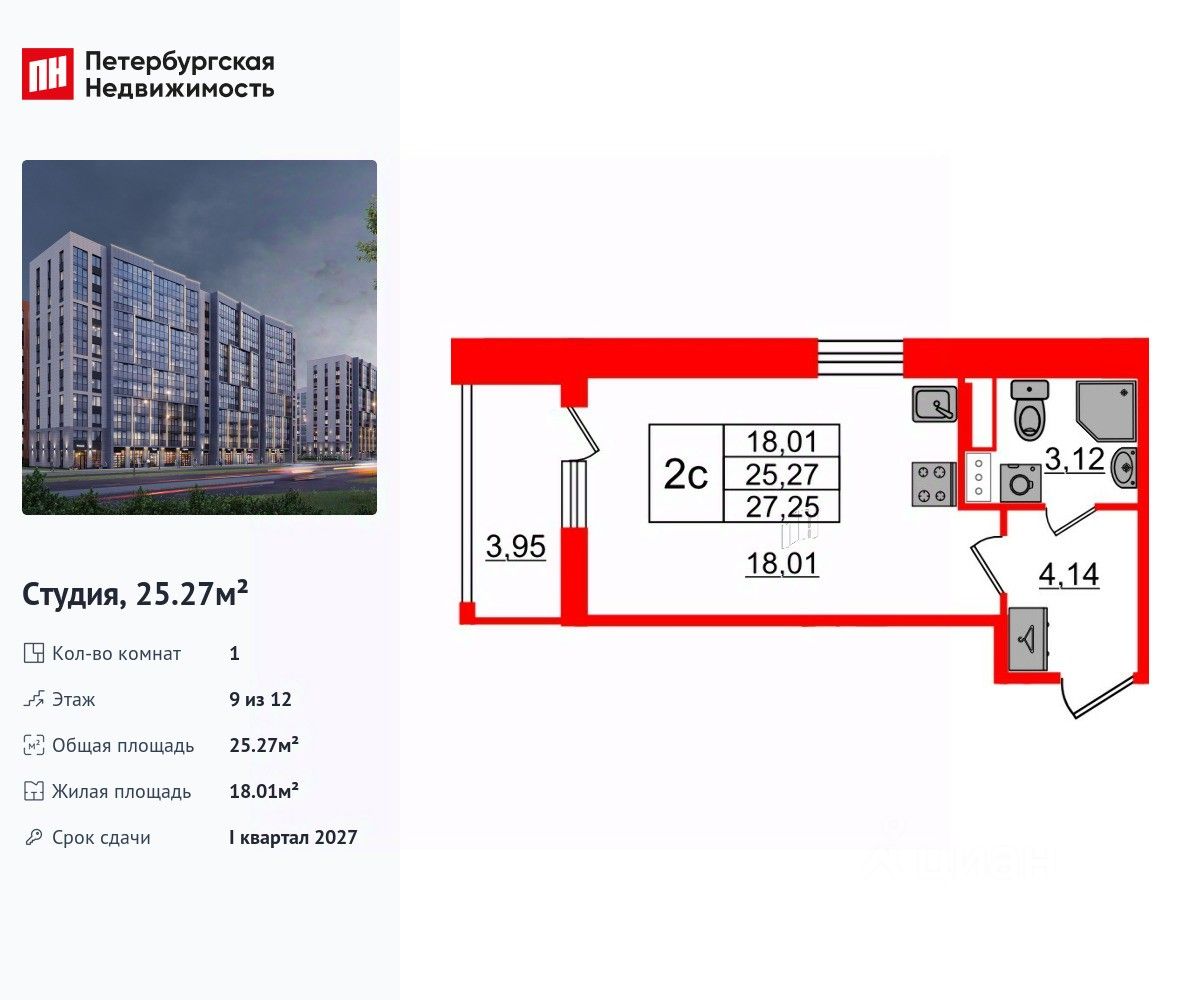 Удобная, классическая, функциональная европланировка, просторная прихожая 4.14 м². Общая площадь студии - 25.27 м², жилая 18.01 м², высота потолка 2.77 м.
