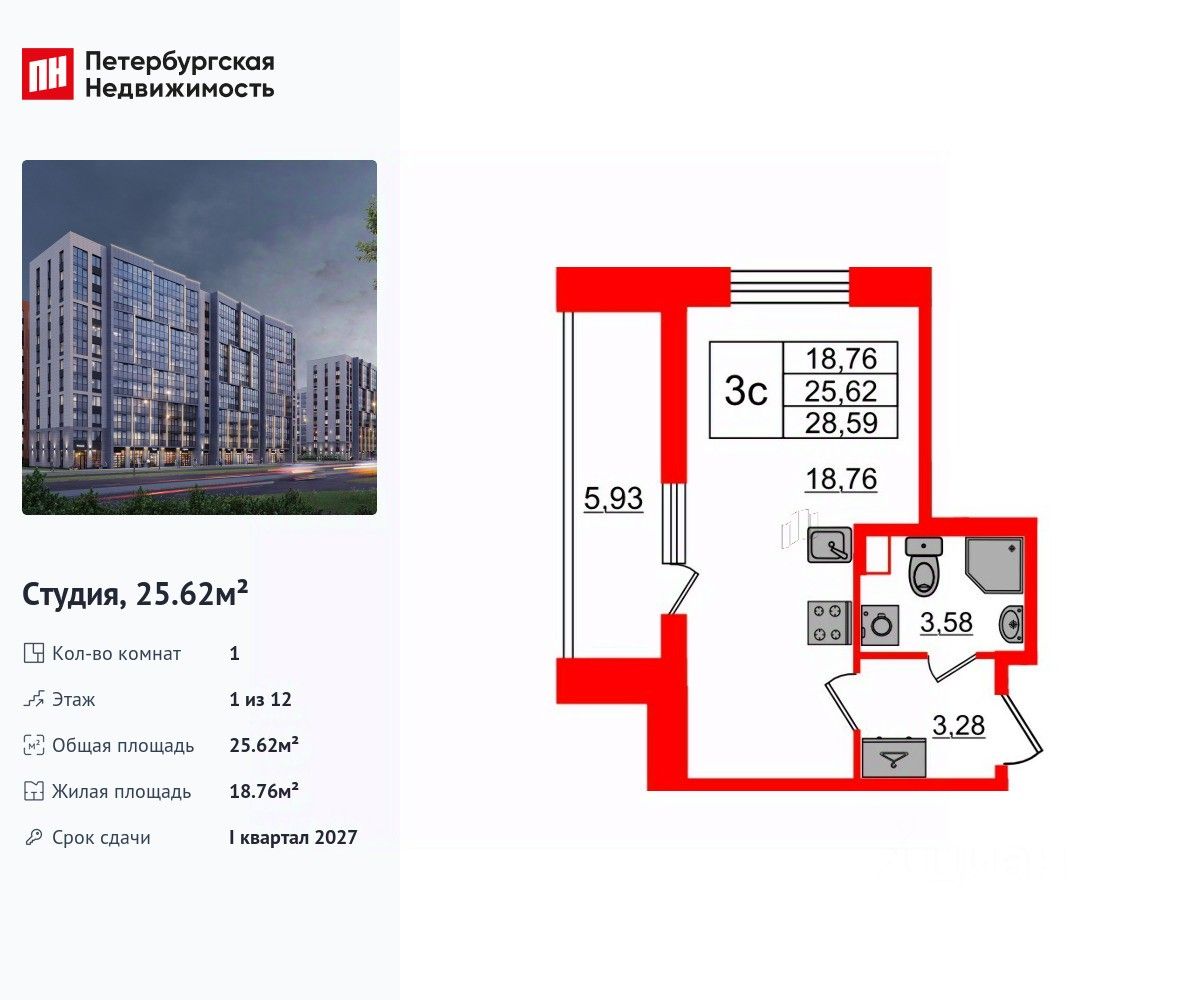 Удобная, классическая, функциональная европланировка, просторная прихожая 3.28 м². Общая площадь студии - 25.62 м², жилая 18.76 м², высота потолка 2.77 м.