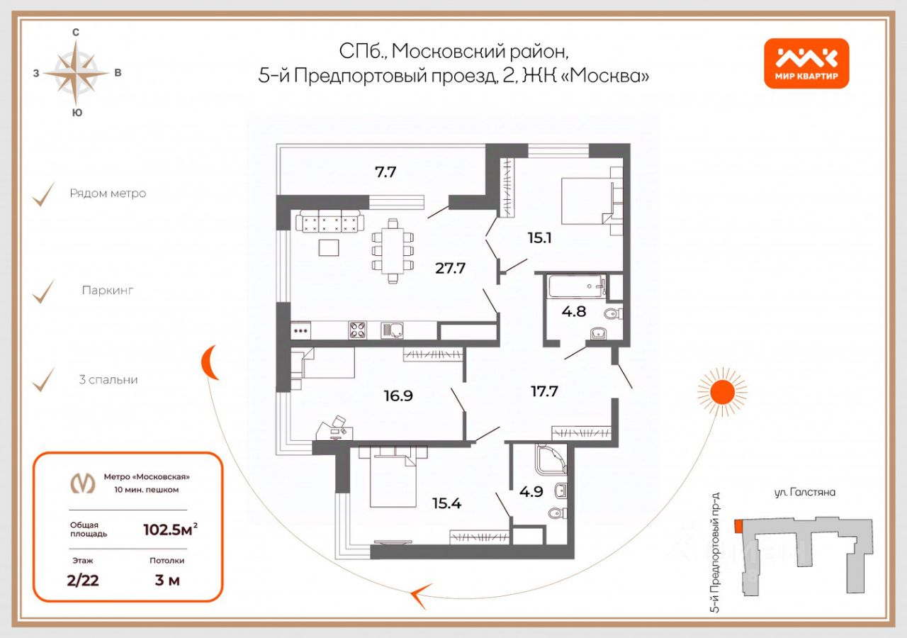 Комплекс расположен в московском районе, в шаге от площади Победы и метро ''Московская''. Выезды на КАД и ЗСД, торговые комплексы, парки для прогулок и все что только можно представить для комфортной жизни - у вас буквально ''под боком''! Это же давно сформировавшийся московский район один из самых комфортных в Петербурге.
