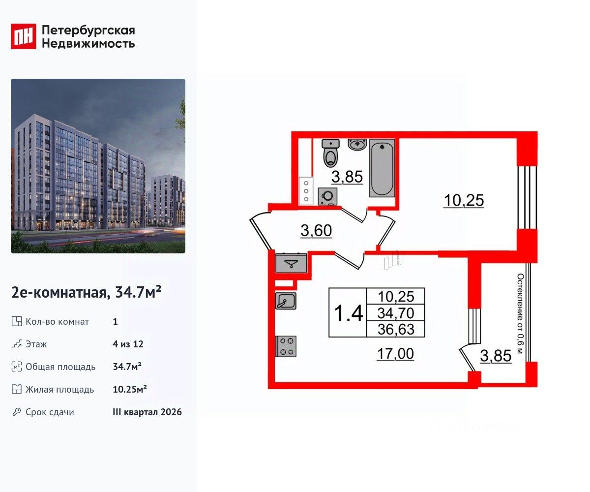Удобная, классическая, функциональная европланировка, большая кухня-гостиная 17 м², вместительная прихожая 3.6 м². Общая площадь квартиры - 34.7 м², жилая 10.25 м², высота потолка 2.77 м.