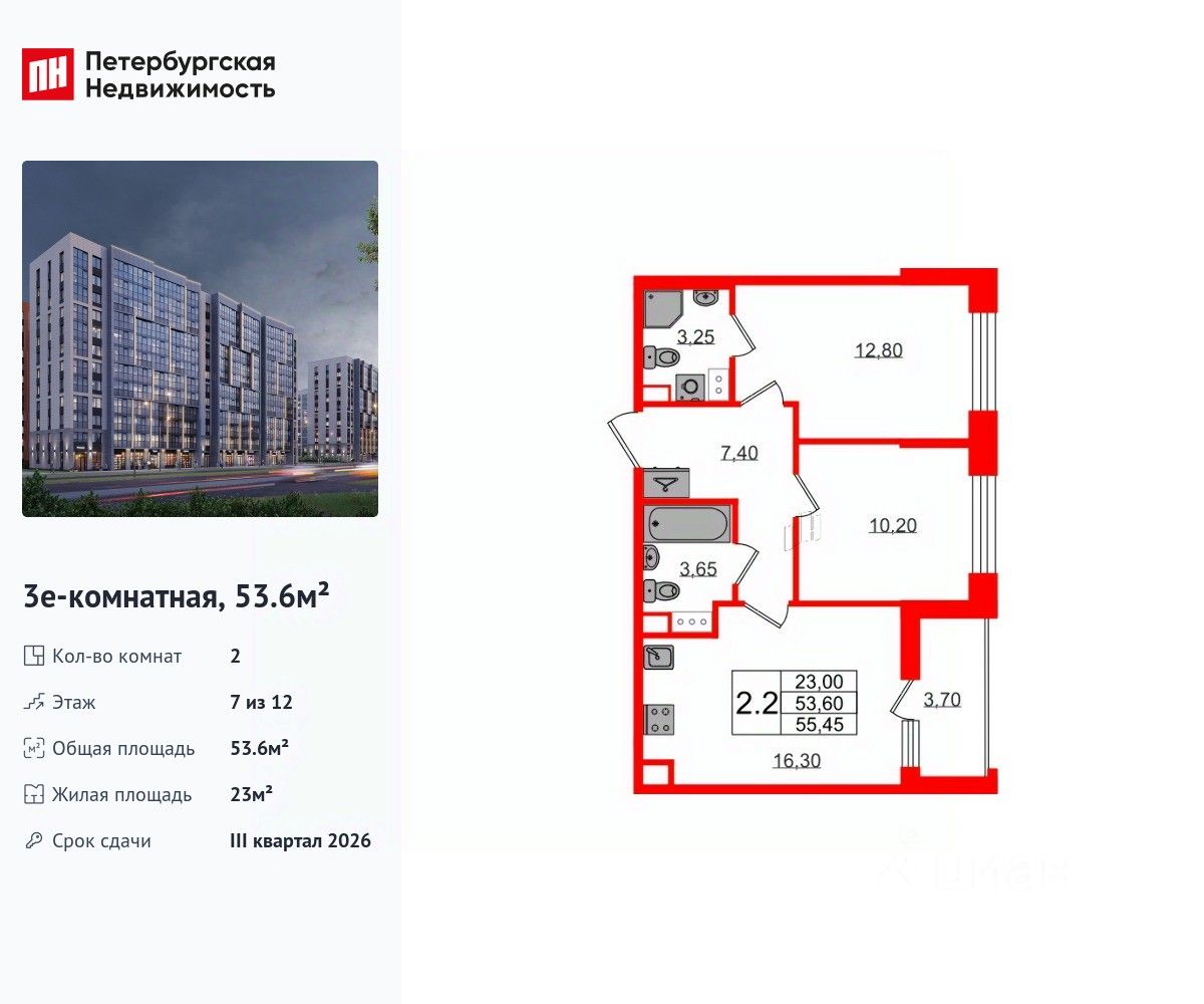 Удобная, классическая, функциональная европланировка, большая кухня-гостиная 16.3 м², вместительная прихожая 7.4 м². Общая площадь квартиры - 53.6 м², жилая 23 м², высота потолка 2.77 м.