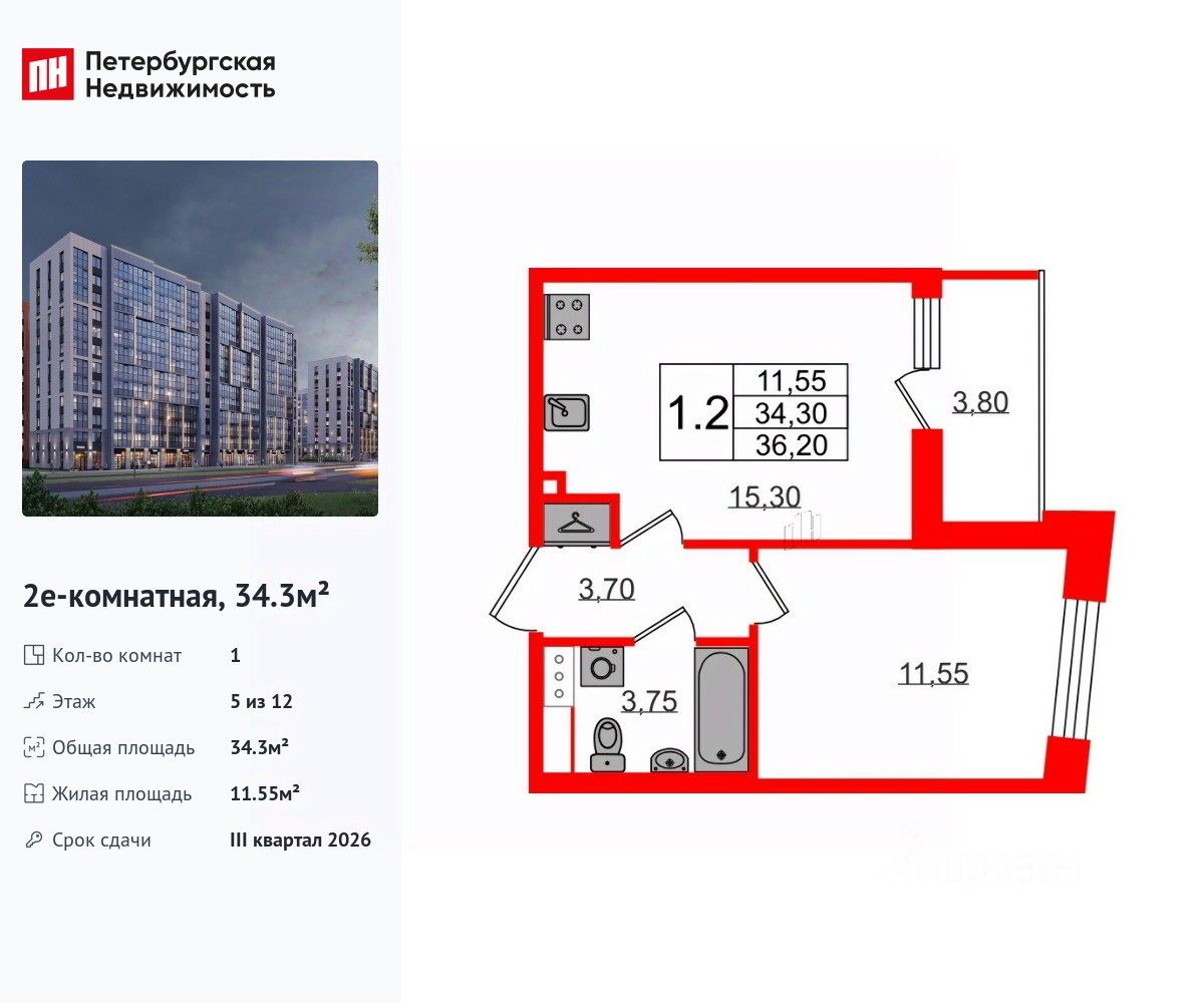 Удобная, классическая, функциональная европланировка, большая кухня-гостиная 15.3 м², вместительная прихожая 3.7 м². Общая площадь квартиры - 34.3 м², жилая 11.55 м², высота потолка 2.77 м.