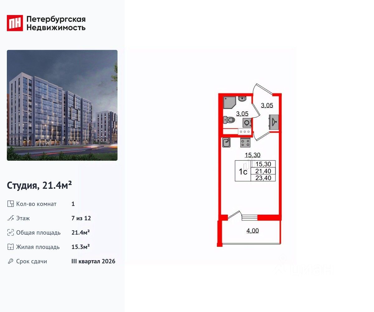 Удобная, классическая, функциональная европланировка, вместительная прихожая 3.05 м². Общая площадь студии - 21.4 м², жилая 15.3 м², высота потолка 2.77 м.