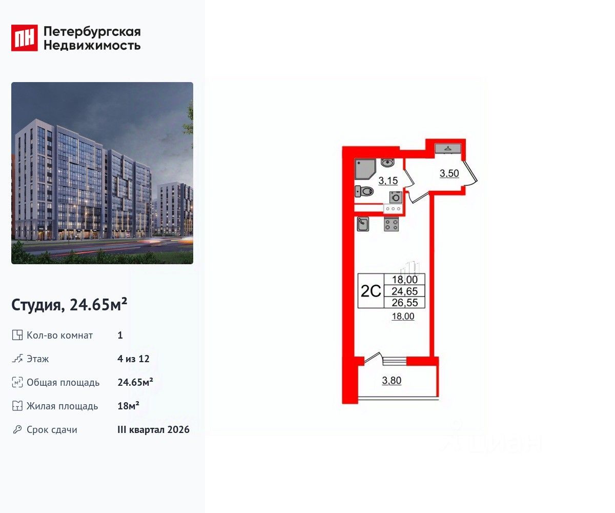 Удобная, классическая, функциональная европланировка, просторная прихожая 3.5 м². Общая площадь студии - 24.65 м², жилая 18 м², высота потолка 2.77 м.