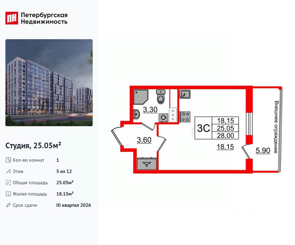 Удобная, классическая, функциональная европланировка, просторная прихожая 3.6 м². Общая площадь студии - 25.05 м², жилая 18.15 м², высота потолка 2.77 м.