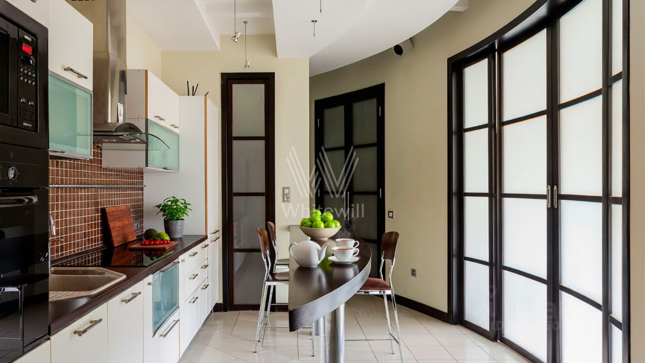 Просторная квартира c одной спальней в сталинском доме на Саввинской набережной. Из квартиры открываются живописные виды на Москву-реку. Высокие потолки создают ощущение простора и комфорта.
