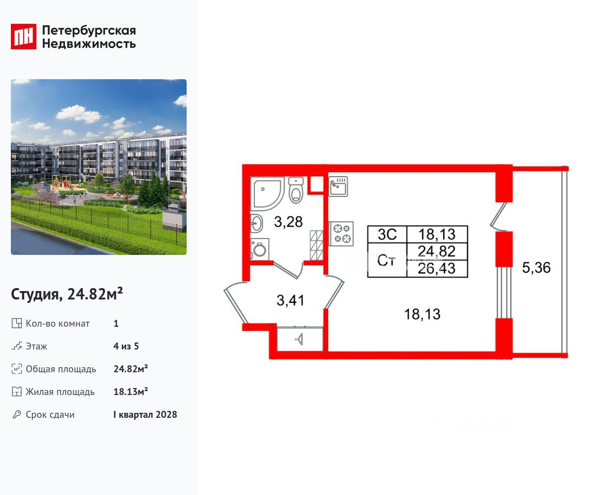 Продается просторная студия от застройщика в жилом комплексе ''Парадный ансамбль'' в престижном Московском районе.