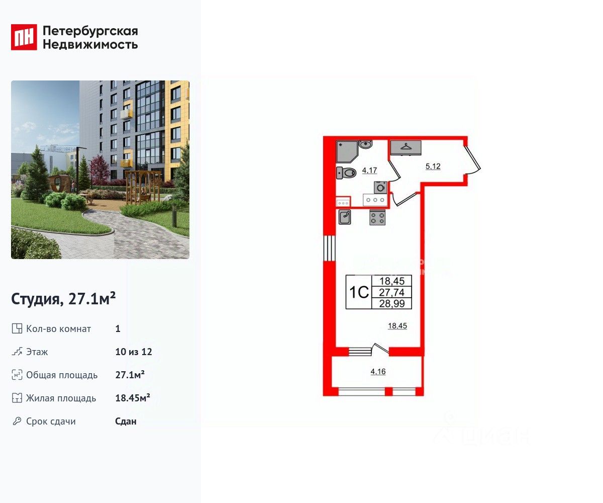 Удобная, классическая, функциональная европланировка, просторная прихожая 5.12 м². Общая площадь студии - 27.1 м², жилая 18.45 м², высота потолка 2.77 м.