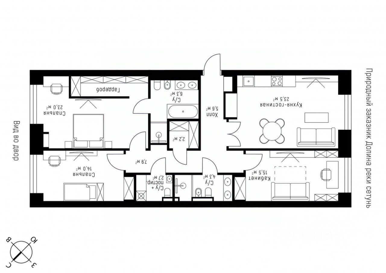 О квартире: Функциональная планировка: 3 спальни (1 из них мастер-спальня со своей ванной комнатой), 3 санузла, кухня-гостиная. Высота потолков 3,1 метра. С кухни-гостиной и одной из спален открываются панорамные виды на западную сторону с фантастическими закатами и природный заказник ''Долина реки Сетунь'', а из других двух спален приятный и спокойный вид во внутренний двор и город.
