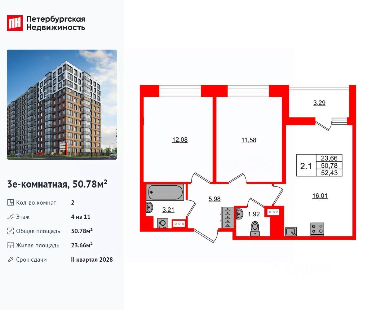 Удобная, классическая, функциональная европланировка, большая кухня-гостиная 16.01 м², вместительная прихожая 5.98 м². Общая площадь квартиры - 50.78 м², жилая 23.66 м², высота потолка 2.77 м.