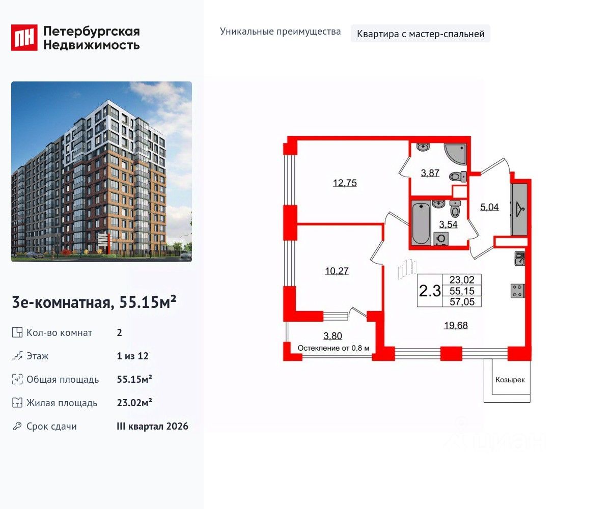 Уникальная, функциональная европланировка, большая кухня-гостиная 19.68 м², вместительная прихожая 5.04 м². Общая площадь квартиры - 55.15 м², жилая 23.02 м², высота потолка 2.77 м.