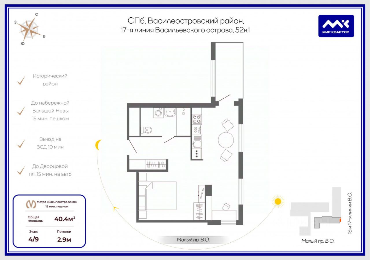 Пешая доступность до основных достопримечательностей города: Кунсткамера, Петропавловская Крепость, Эрмитаж.