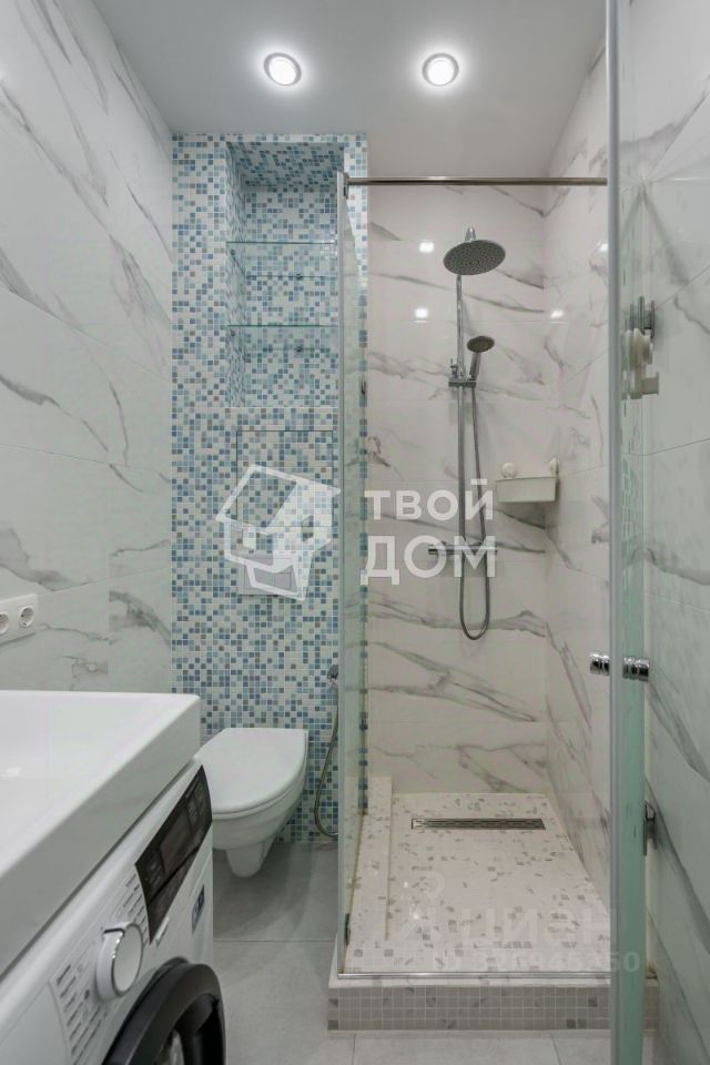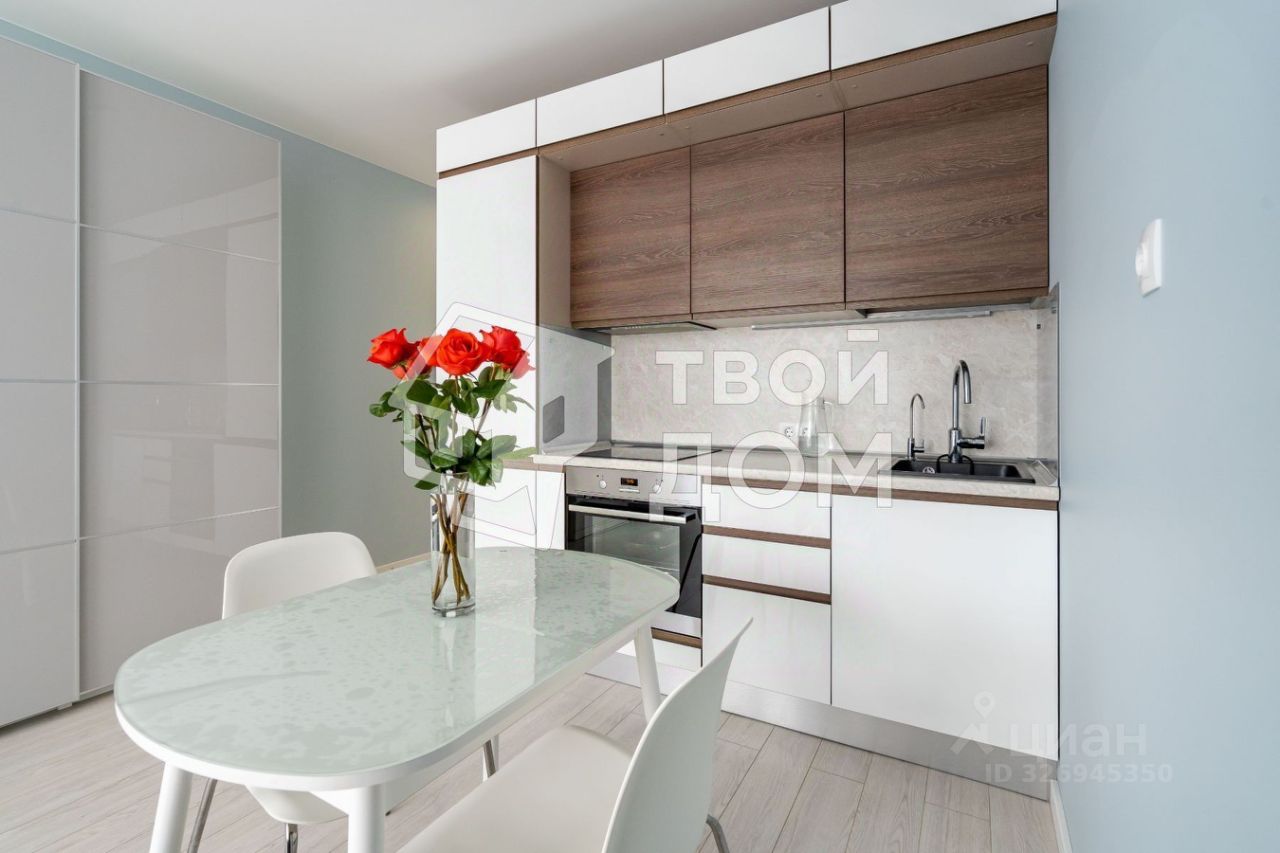 - Оборудованная кухня с встроенной техникой (духовой шкаф и варочная поверхность), шкаф-кровать (трансформер), в санузле застекленная душевая кабина на подиуме, гигиенический душ