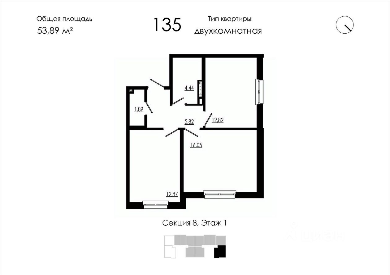 Общая площадь53,89 м2