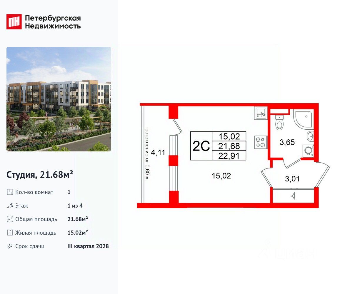 Общая площадь21,68 м2