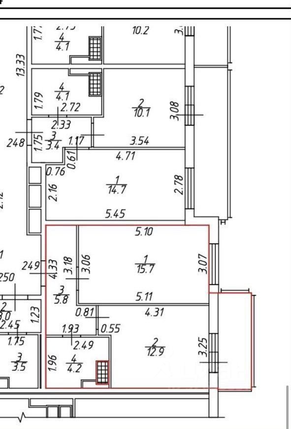 Площади: - общая площадь квартиры 44,3 м2 - площадь без лоджии 38,6 м2 - комната 15,7 м2 - кухня 12,9 м2 - санузел 4,2 м2 - коридор 5,8 м2 - лоджия 5,7 м2