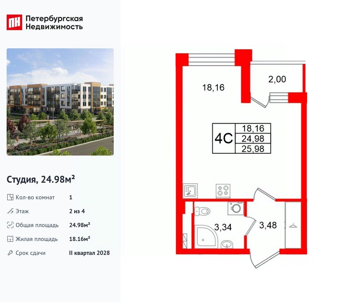 Удобная, классическая, функциональная европланировка, вместительная прихожая 3.08 м². Общая площадь студии - 24.98 м², жилая 18.16 м², высота потолка 2.77 м.