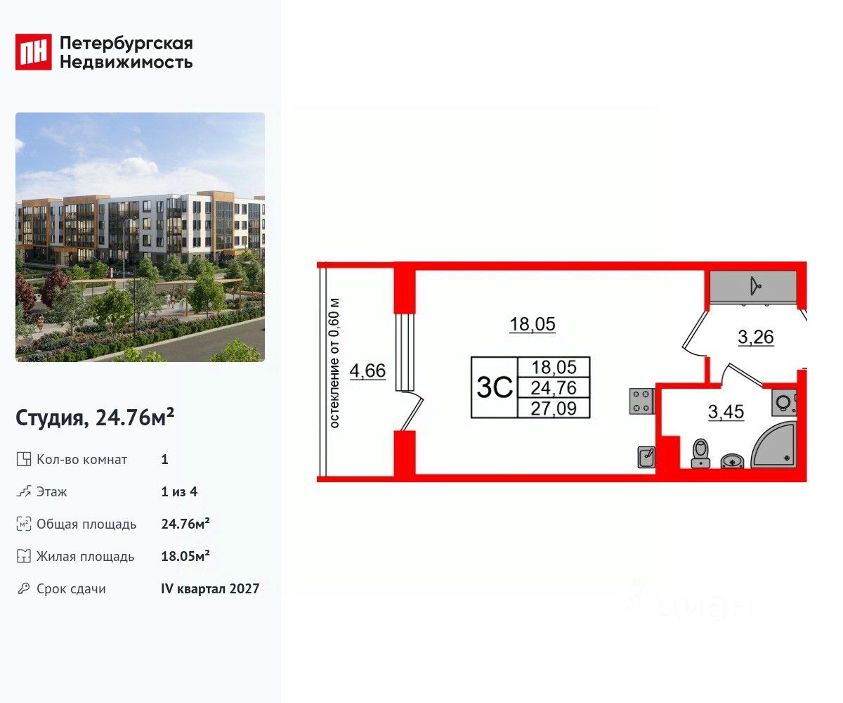 Продается просторная студия от застройщика в жилом комплексе ''Univer City'' в на юге Санкт-Петербурга.