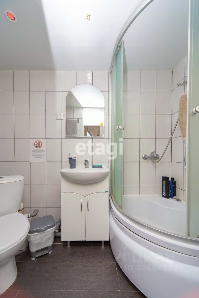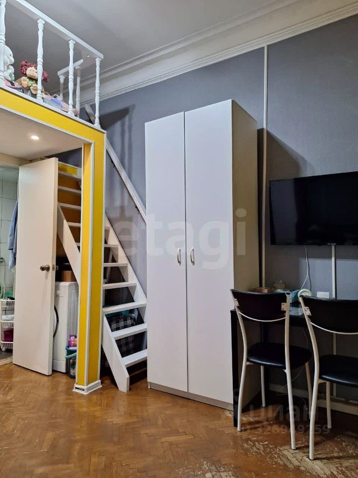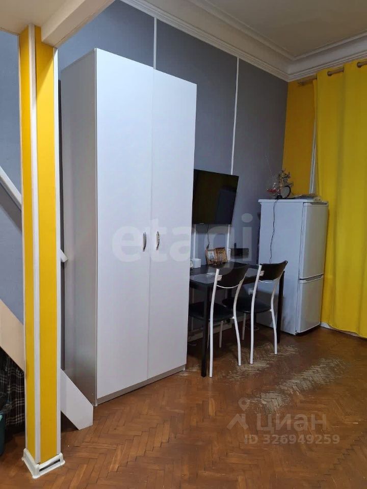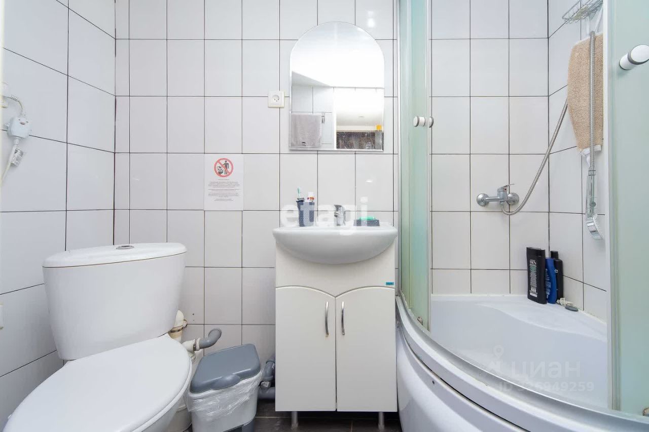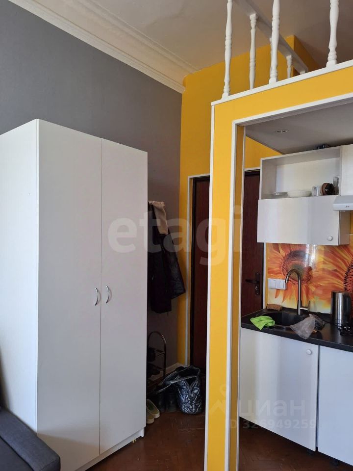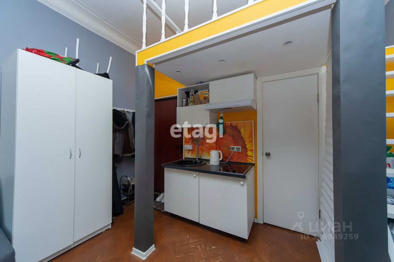 Объект находится в коммунальной квартире и полностью обустроен для самостоятельного проживания. В студии предусмотрена собственная кухонная зона, оснащенная раковиной, варочной панелью и холодильником, а также установлена стиральная машина. Санузел оборудован душевой кабиной.
