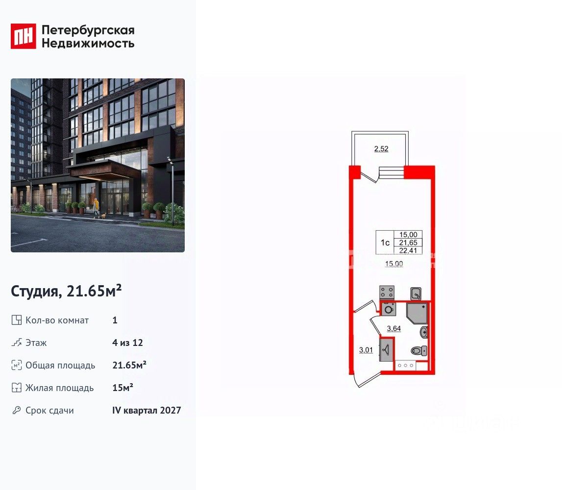 Удобная, классическая, функциональная европланировка, вместительная прихожая 3.01 м². Общая площадь студии - 21.65 м², жилая 15 м², высота потолка 2.75 м.
