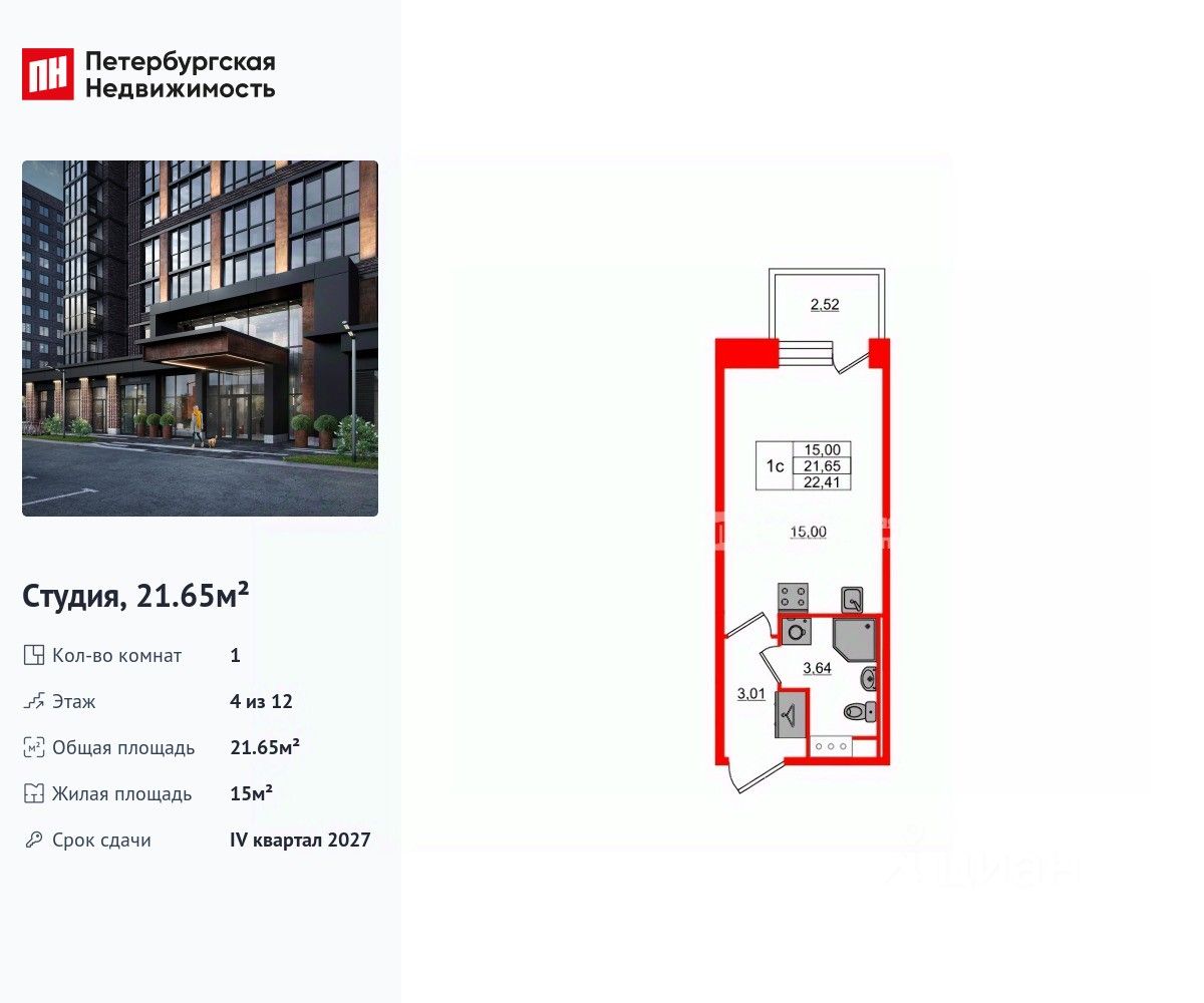 Удобная, классическая, функциональная европланировка, вместительная прихожая 3.01 м². Общая площадь студии - 21.65 м², жилая 15 м², высота потолка 2.75 м.