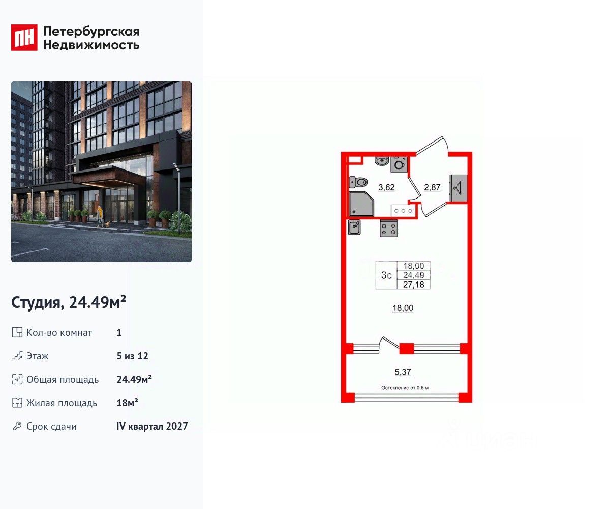 Удобная, классическая, функциональная европланировка, вместительная прихожая 2.87 м². Общая площадь студии - 24.49 м², жилая 18 м², высота потолка 2.75 м.