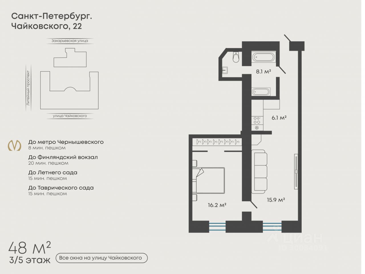 Квартира общей площадью 48 м расположена на 3м этаже пятиэтажного дома, откуда открывается вид на красивейший особняк Нарышкиных-Трубецких, функционирующий как музей и место проведения выставок. Из окон также видно зеленый газон с деревьями, памятник Петру и Февронии, покровителям семьи, установленный напротив Дворца обручальных колец.