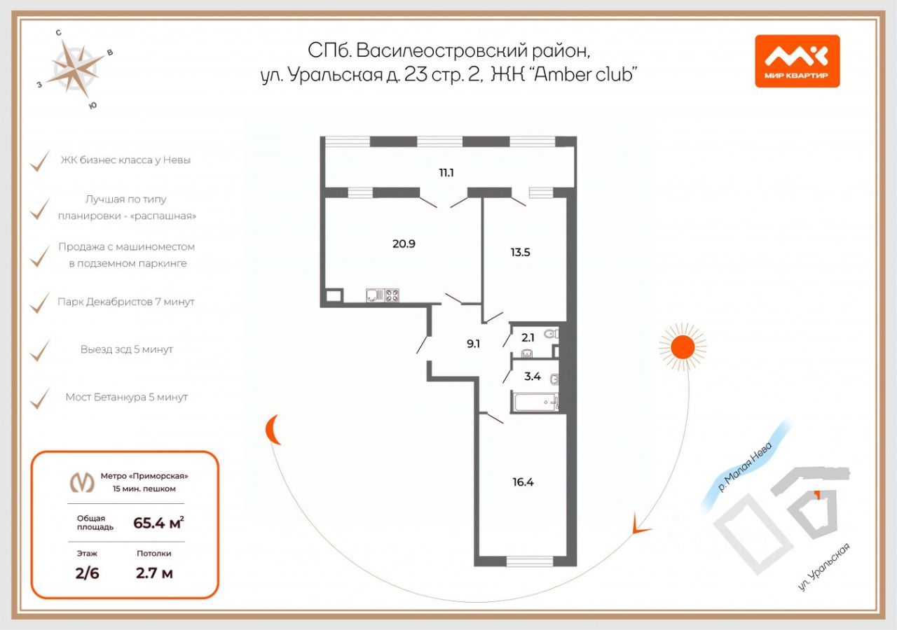 Про дом и локацию: Комплекс находится между набережной Макарова и Уральской улицей. Дома ориентированы к воде, чтобы как можно больше жителей могли любоваться или гулять вблизи панорамных видов Невы. Элегантные входные группы, выполненные в актуальном дизайнерском ключе, создают безупречное первое впечатление. Пространство дополнено стильным лобби с функциональным ресепшеном, где предусмотрено всё для комфортного приёма гостей и отдыха. Дом оборудован пассажирским и грузовым лифтом, спускающимся в подземный паркинг.