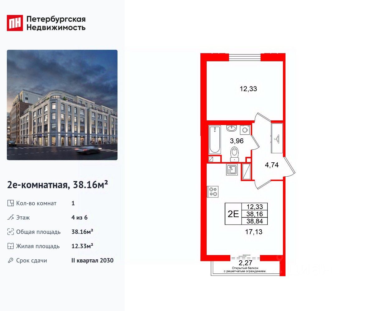 Удобная, классическая, функциональная европланировка, большая кухня-гостиная 17.13 м², просторная прихожая 4.74 м². Общая площадь квартиры - 38.16 м², жилая 12.33 м², высота потолка 3 м.
