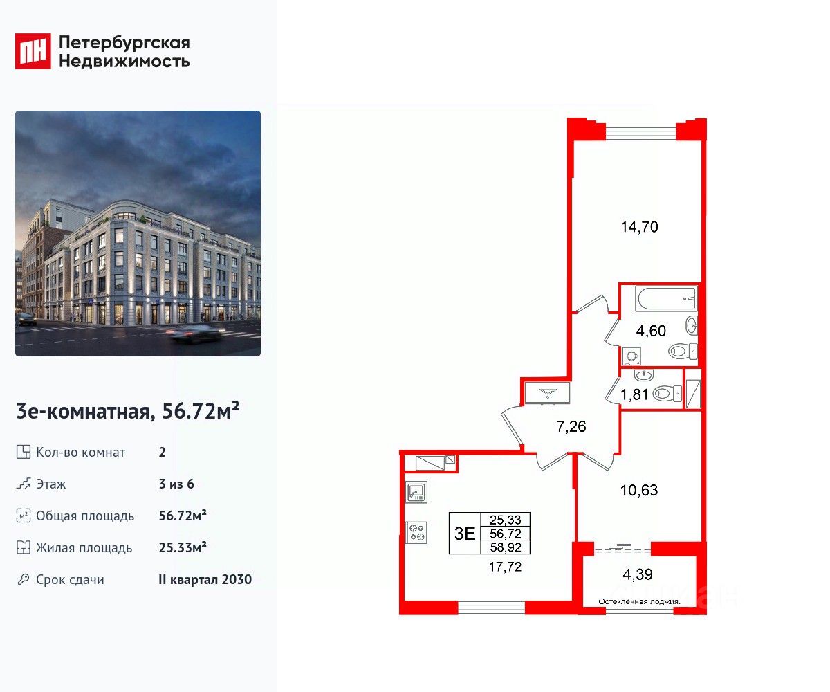 Удобная, классическая, функциональная европланировка, большая кухня-гостиная 17.72 м², вместительная прихожая 7.26 м². Общая площадь квартиры - 56.72 м², жилая 25.33 м², высота потолка 3 м.