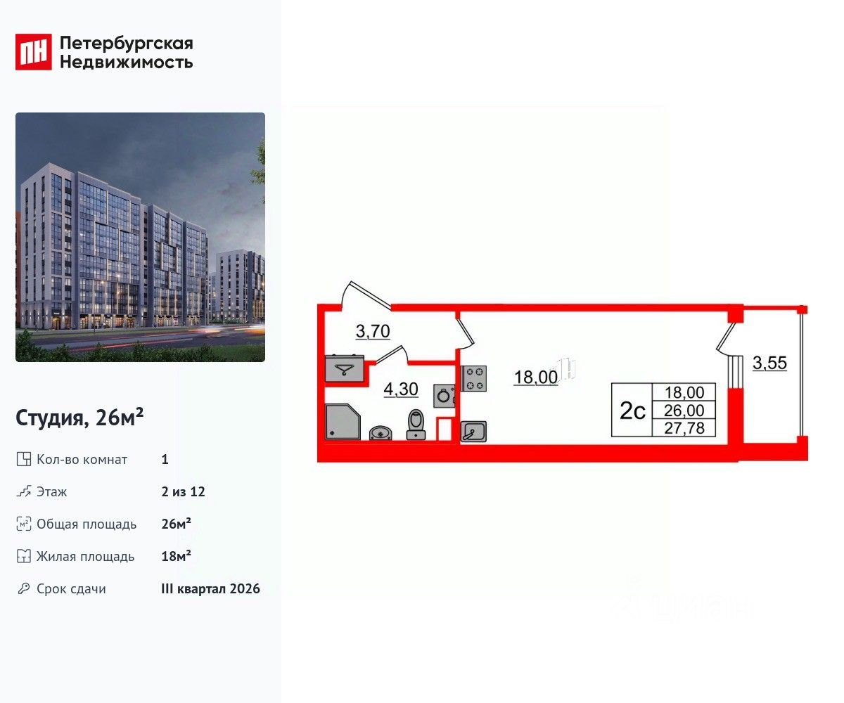 Удобная, классическая, функциональная европланировка, просторная прихожая 3.7 м². Общая площадь студии - 26 м², жилая 18 м², высота потолка 2.77 м.