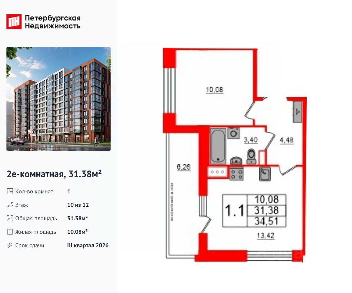 Удобная, классическая, функциональная европланировка, большая кухня-гостиная 13.42 м², просторная прихожая 4.48 м². Общая площадь квартиры - 31.38 м², жилая 10.08 м², высота потолка 2.77 м.