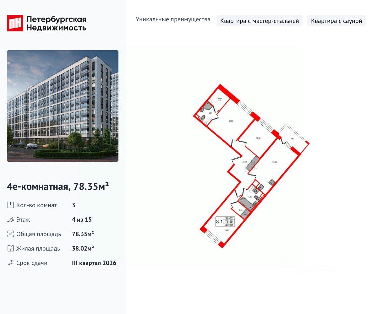 Уникальная, функциональная европланировка, большая кухня-гостиная 17.06 м², вместительная прихожая 10.26 м². Общая площадь квартиры - 78.35 м², жилая 38.02 м², высота потолка 2.75 м.