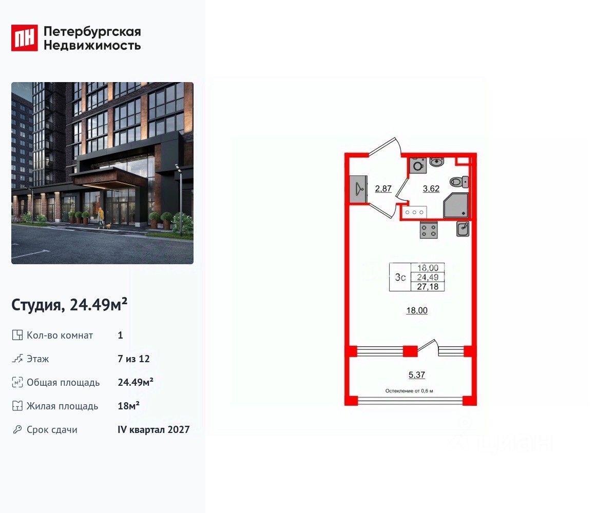 Удобная, классическая, функциональная европланировка, вместительная прихожая 2.87 м². Общая площадь студии - 24.49 м², жилая 18 м², высота потолка 2.75 м.